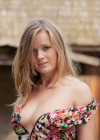 Sexy babe in floral dress walks barefoot on green lawn but later lies down on grass to masturbate