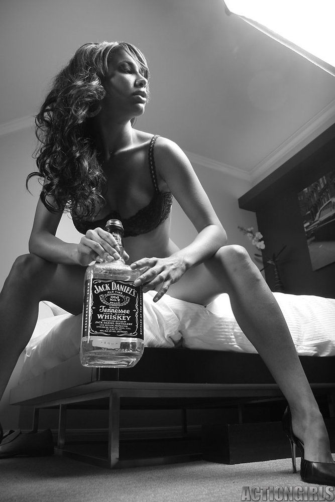 Gorgeous lady poses in sexy lingerie, plays with whisky bottle and her own pussy.
