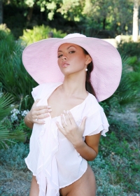 Busty brunette wearing white clothes and pink hat is touching herself outdoors