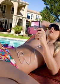 Awesome blonde is having filthy fun next to the big swimming pool with pleasure