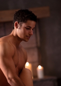 Strong dude rubs his busty girlfriend on a bear-skin at the fireplace.