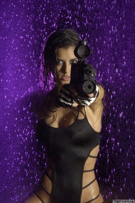 Daredevil princess feeling unrivaled holding a massive toy gun while posing for the cam