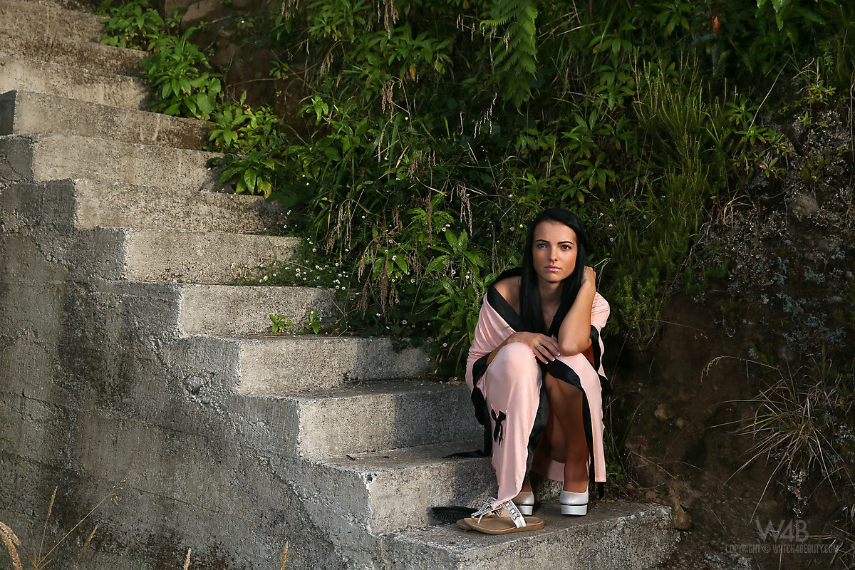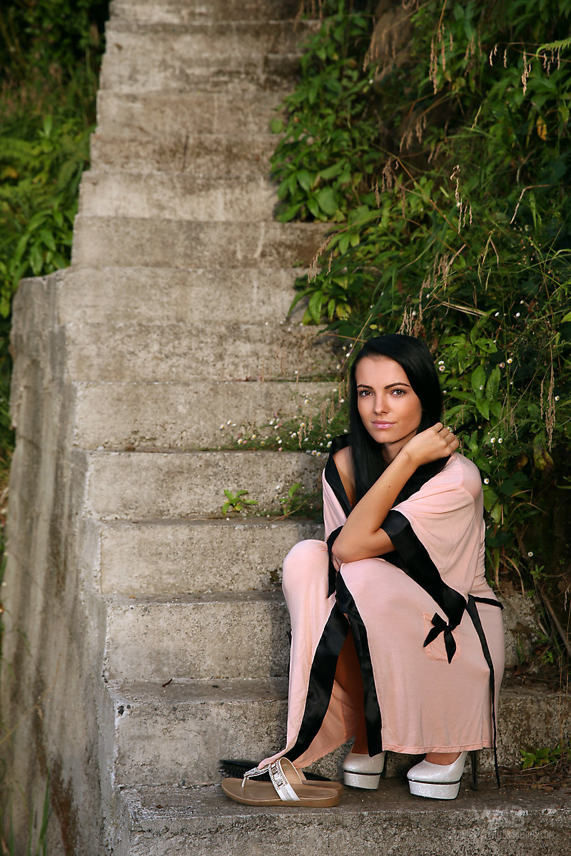 Lovely brunette wearing awesome dress and shoes is demonstrating solo skills outdoors