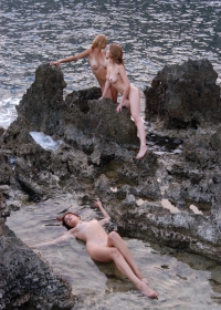 At the beach, these three babes get naked and have fun climbing around on the rocks.