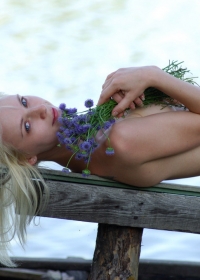 Half-naked blonde caresses her tits with a bouquet of fresh flowers near a local river