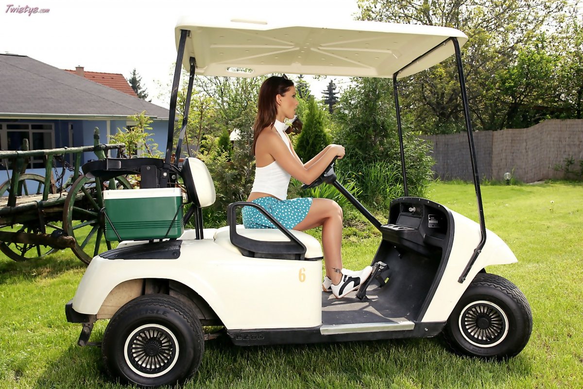 Lovely brunette wearing sexy blue skirt is riding golf car and masturbating her pussy
