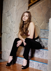 Long-legged babe poses half-naked before undressing on stairs and showing shaved pussy.