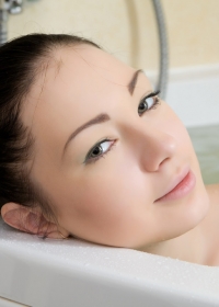 Wonderful young brunette having hairy twat is touching herself in the bathtub